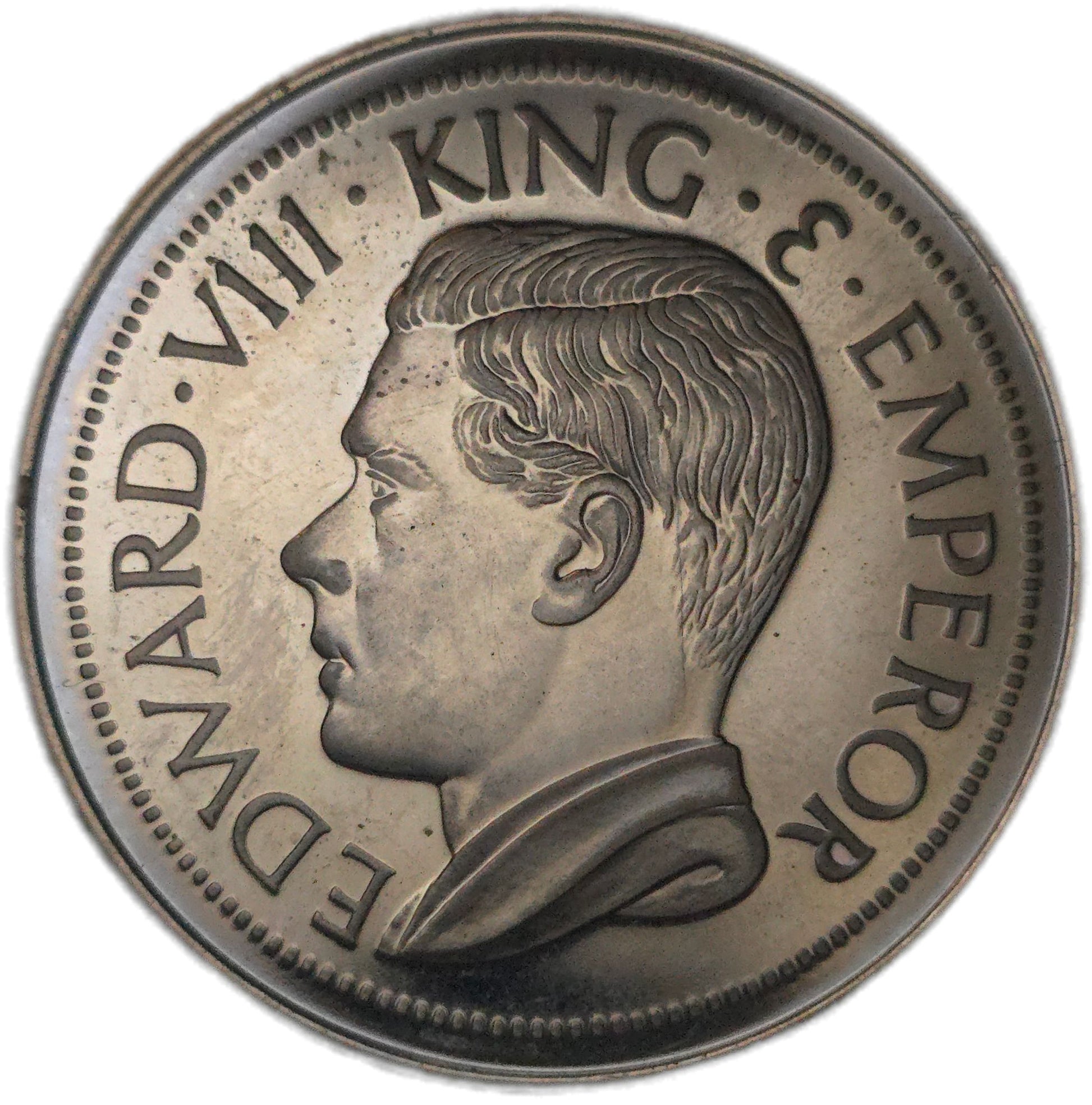 A 1936 King Edward VIII fantasy crown produced as a 1972 retro pattern by Richard Lobel, presented as a New Zealand-style commemorative piece. It celebrates the brief reign of Edward VIII with a collectible design intended for enthusiasts of historical and pattern coins.