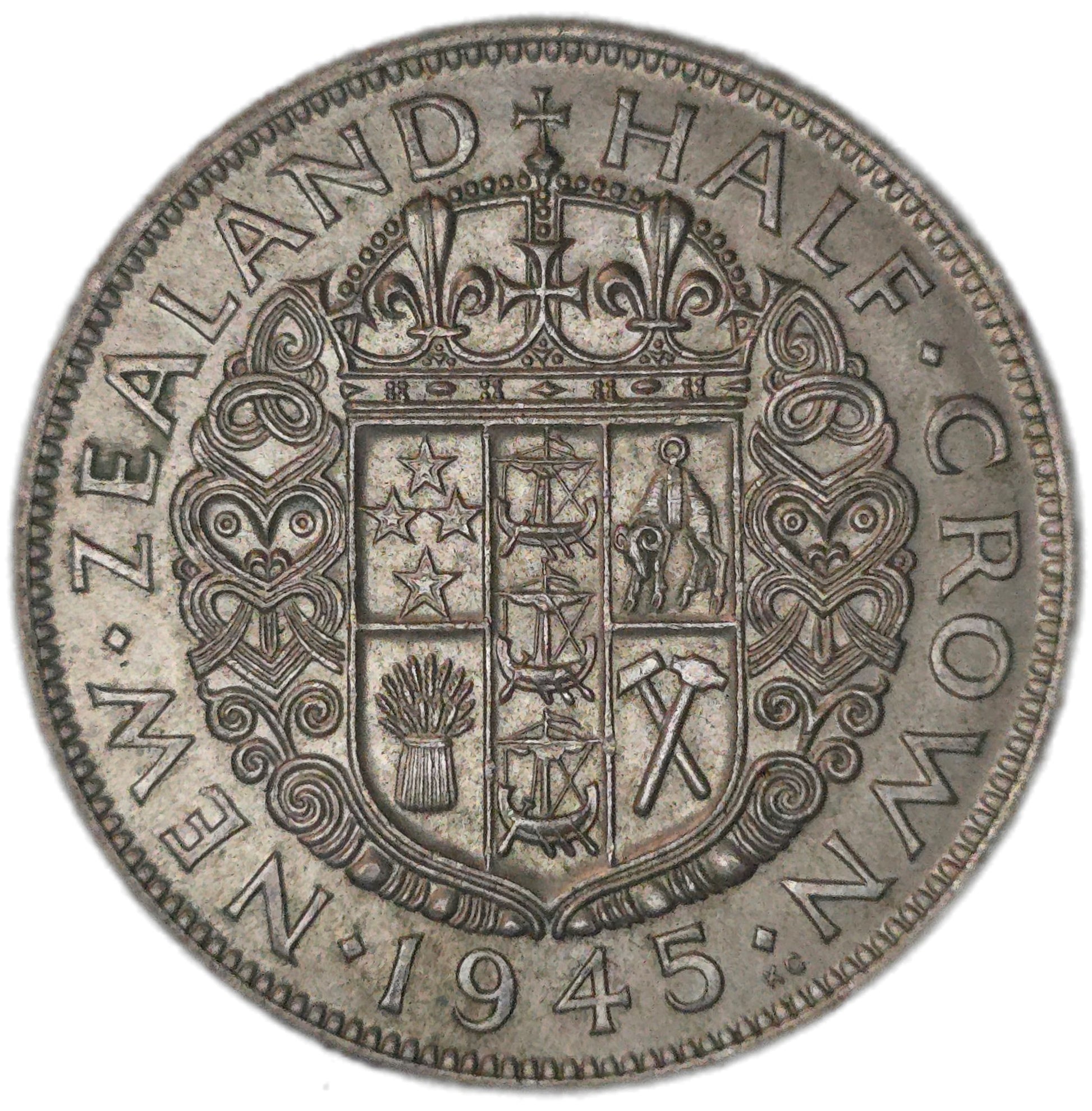 A 1945 New Zealand Half Crown, a mid-20th century silver coin from New Zealand with attractive original mint luster and only light evidence of circulation. With a modest mintage of just 420,000.