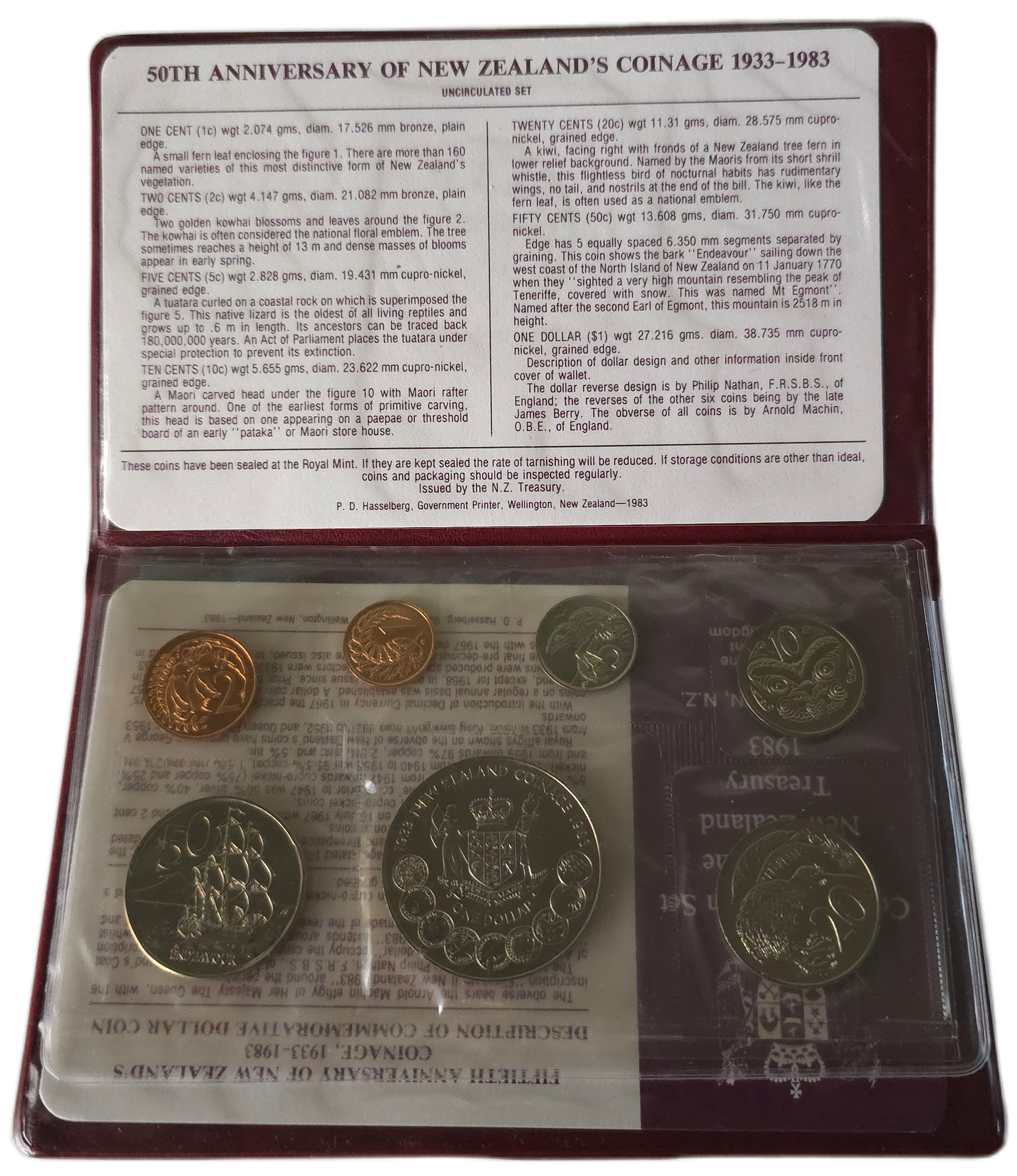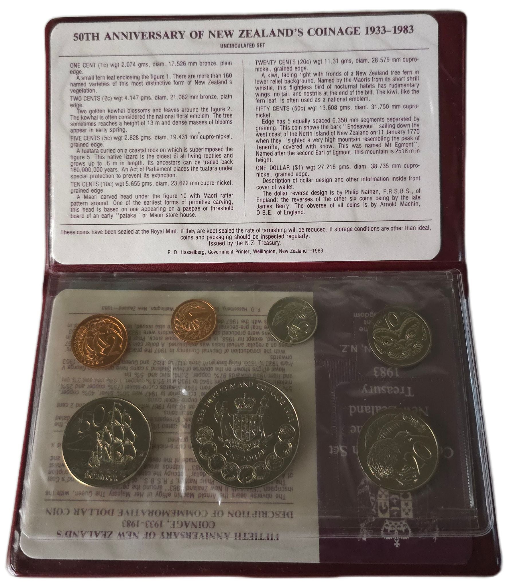 A commemorative 1983 New Zealand coin set celebrating the 50th anniversary of New Zealand coinage. It is presented in uncirculated condition for collectors.
