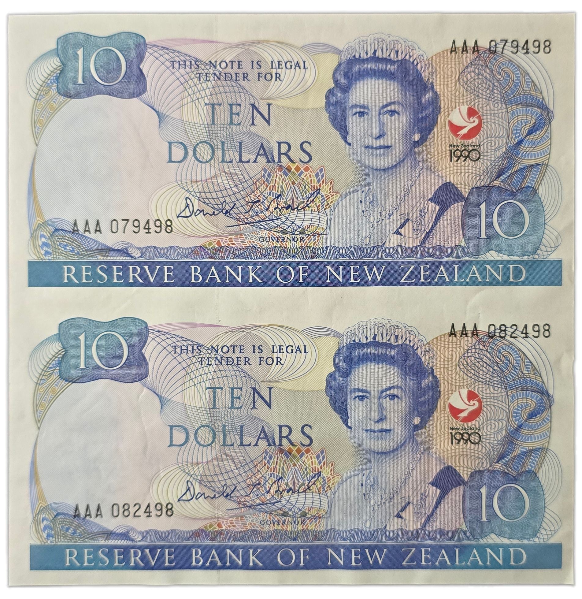 1990 New Zealand Ten Dollar note uncut pair with AAA prefix, issued for the 150 Years Waitangi commemorative series. Ideal for framing or display.