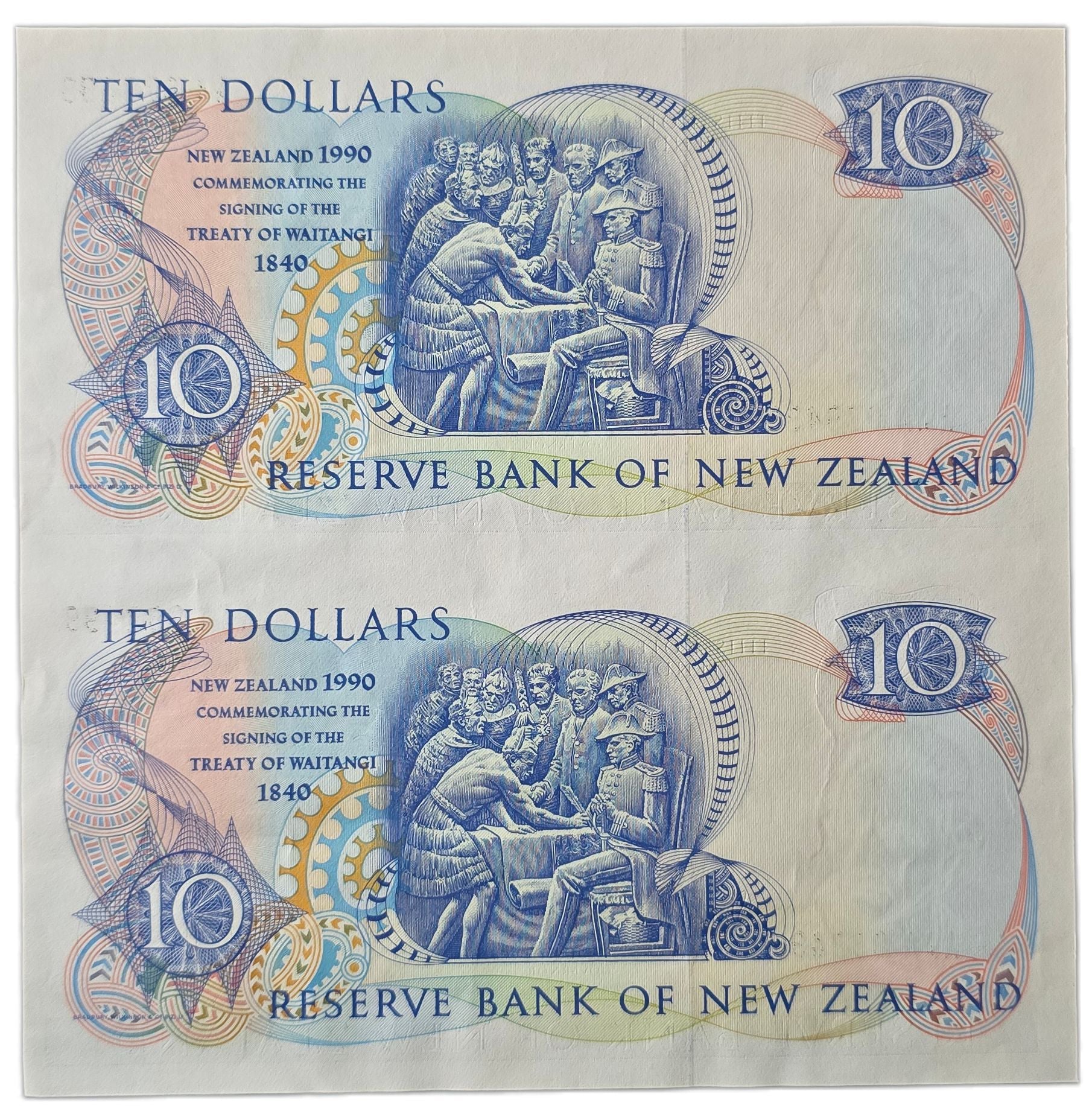 1990 Ten Dollar Notes Uncut Pair, 150 Years Waitangi Commemorative [random prefix]