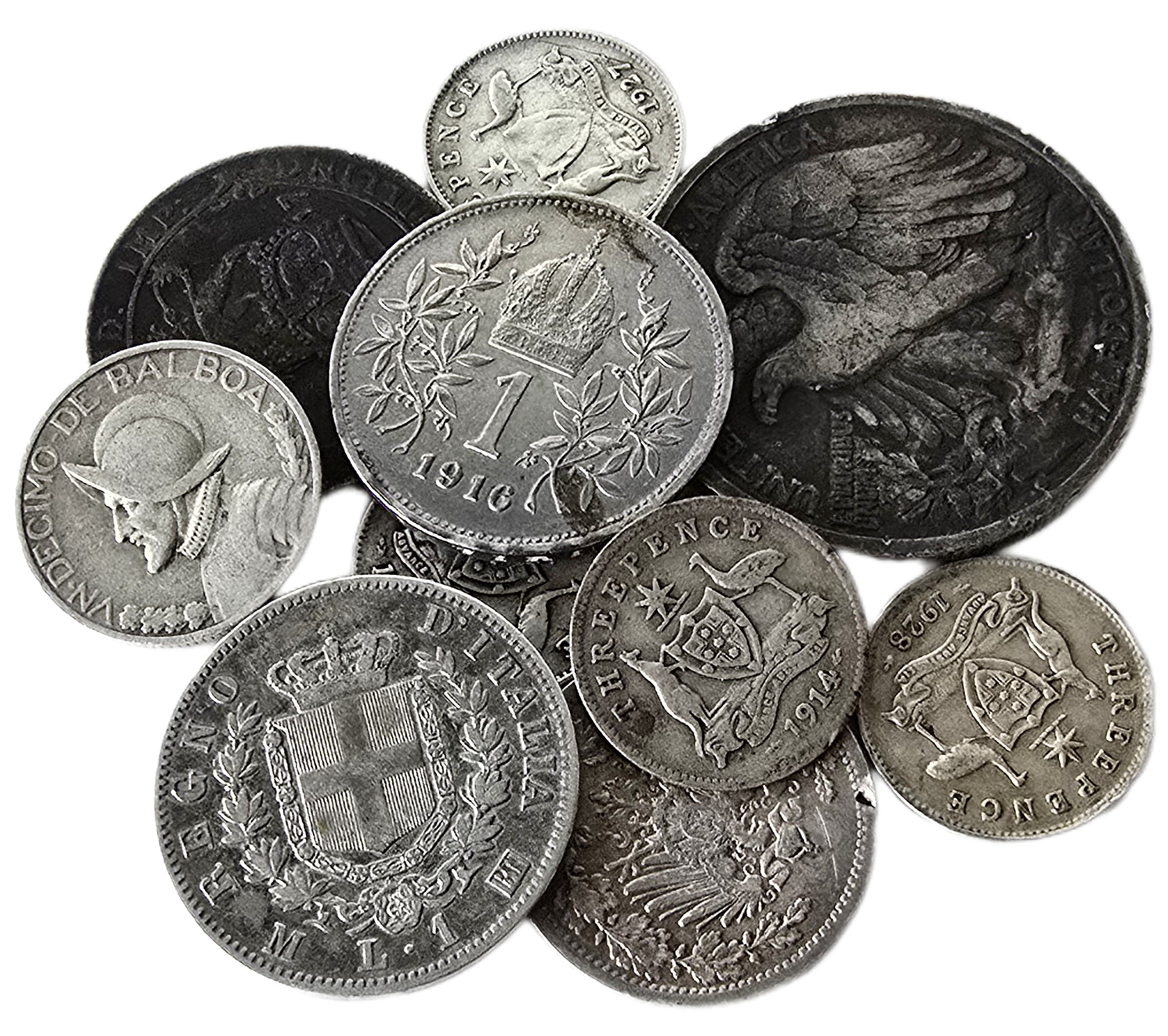 Selection of silver coins from around the world containing 80-92.5% silver.