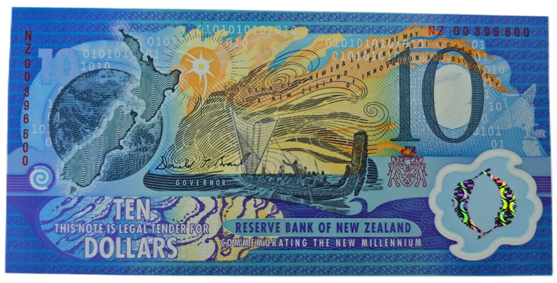 This is a New Zealand commemorative $10 bank note issued to celebrate the turn of the millennium. It features a red serial and comes with a booklet.
